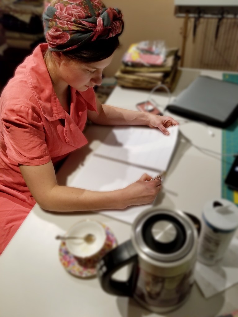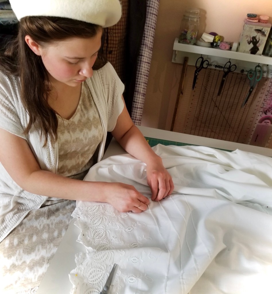 I had a lot of ideas coming into this apprenticeship: images and notions of what it might be. Really they weren’t wrong. It has been exciting and incredible! Of course no matter how wonderful a job and how much you love your work, it is still work, and some days are long and hard. Sometimes you have to seam rip a mistake, and sometimes it’s frustrating. I think our social media followers sometimes imagine all we do is run through meadows in historical dresses. While we do plenty of this we also work plenty too. This didn’t really come as a surprise or a shock, more of something you expect. Of course good conversation, some vintage music, and fresh brewed tea make the hardest of workdays pass pleasantly. Something I really enjoy about this whole experience is the hands-on learning, and the gift of being taught. I have self-taught myself a lot of skills throughout my life, so it is quite amazing not to have to self teach myself all the things I’m learning here. I also enjoy that there isn’t much bookwork. It’s different from a regular college. I thrive under the encouragement and support of those around me, and feel like I have grown in so many ways! I look forward to the next 2 years. It will be amazing to learn more, and as others join our team to teach them some simple things I’ve already learned.