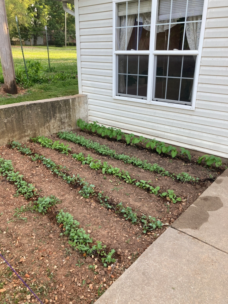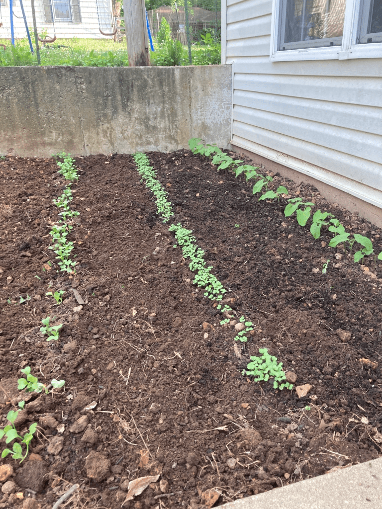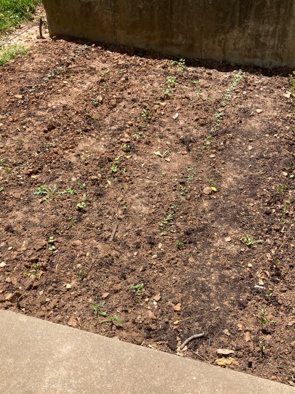 At first glance, there is nothing very exciting about this picture. Muddy/Clay soil with small specks of green. But for me, this was very encouraging! I live in a small apartment complex. My apartment used to be an office and out in front is a side walk and on either side, weedy dirt beds. Although people were convinced no vegetables would grow in such poor soil, I was determined. After asking my landlord’s permission and buying some fertilized dirt I planted some seeds.